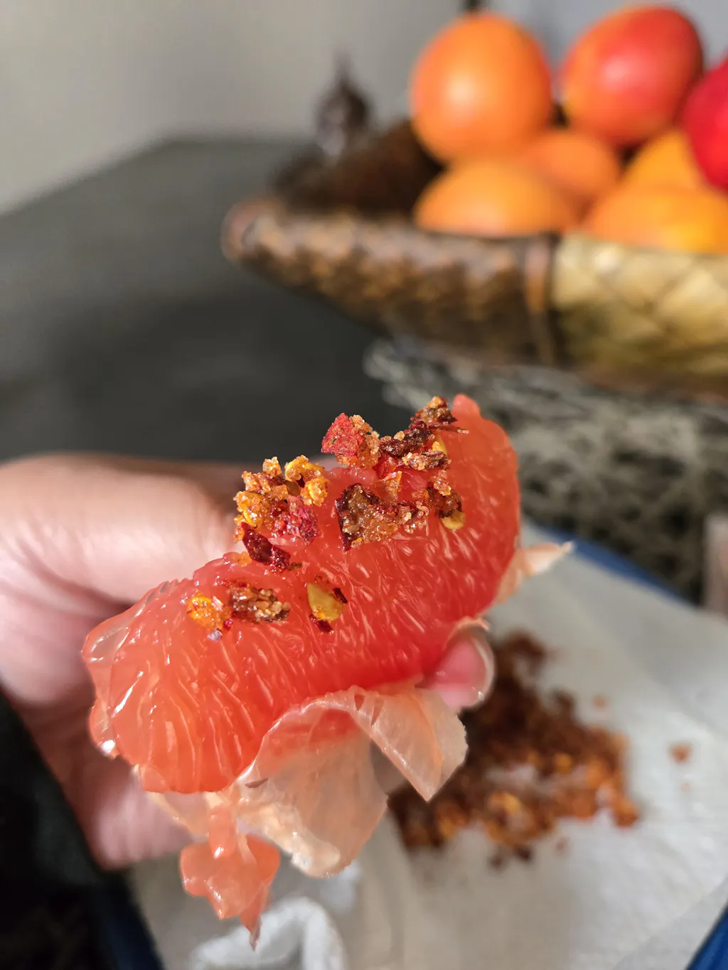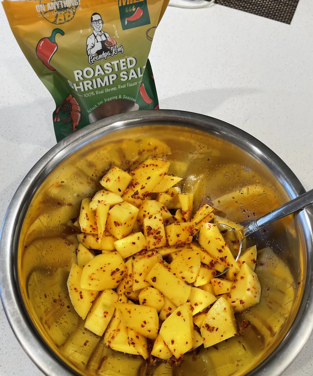 I’m obsessed with this shrimp salt. It seriously goes with everything. I sprinkle it on raw green mango and it brings out the perfect mix of salty, tangy, and savory. It also tastes amazing with strawberries or apples — it adds this subtle umami that makes the fruit pop even more. I keep reaching for it way more than I expected!